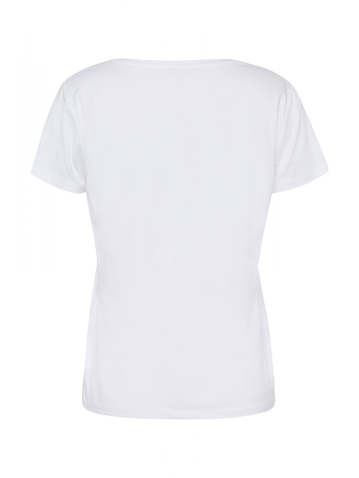 Белая однотонная футболка из смесового хлопка украшена принтом-надписью, Короткий втачной рукав, овальный вырез горловины. Футболка может служить самостоятельным верхом в теплую погоду или надеваться под блейзер, жакет или кардиган.