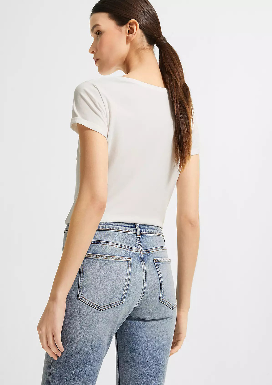 Однотонная белая футболка – базовый элемент любого современного гардероба. Короткий втачной рукав с отворотом, широкий овальный вырез горловины. На груди накладной карман, украшенный декоративной лентой.