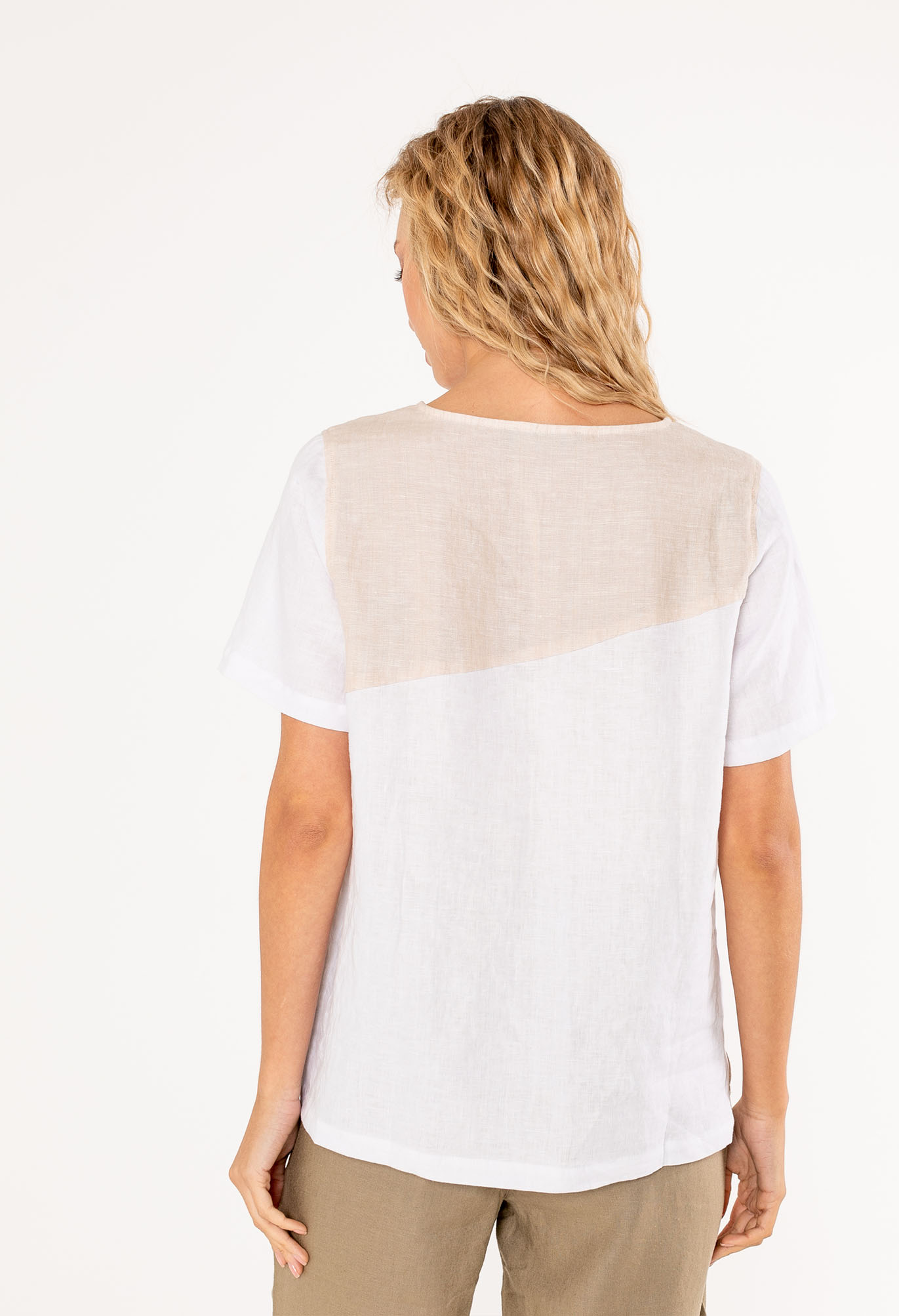 На сайте указаны российские размеры. Ткань: Легкая блузка из 100% льна. Лен – идеальный природный материал, который выбирают за приятные ощущения на теле, воздухопроницаемость и дорогую стильную фактуру. Крой: Свободная блузка с коротким рукавом – идеальная базовая модель, которая не сковывает движение и дарит максимальный комфорт. Круглый вырез добавляет элементов casual и спорт-шик, позволяя создавать сотни образов для повседневной жизни. Универсальность модели одинаково выигрышно смотрится на разных типах фигур, широкая линейка до 56 размера позволяет удовлетворить спрос женщин разной комплекции. Отделка: непревзойденный стиль блузки создает союз из двух сдержанных, но стильных оттенков, которые подчеркнут красоту женщин разных цветотипов. Комбинация цветных блоков или Color Block – нескучная классика, не выходящая из моды, но приковывающая сотни взглядов к удивительному контрасту на одежде.