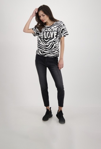 На сайте указаны российские размеры. Модная трикотажная футболка от monari очень удобна в носке благодаря струящемуся качеству из вискозы и модала. Модель с короткими рукавами имеет классический крой, круглый вырез горловины с планкой и блестящим оверлочным швом с люрексом, слегка приспущенные плечи и подол с кулиской и завязкой. Тигровый принт украшен гламурными лакированными буквами с блестящими деталями спереди и придает модели с изображением животных женственный оттенок. Смотрите сами. Модель ростом 179 см Длина платья 62 см