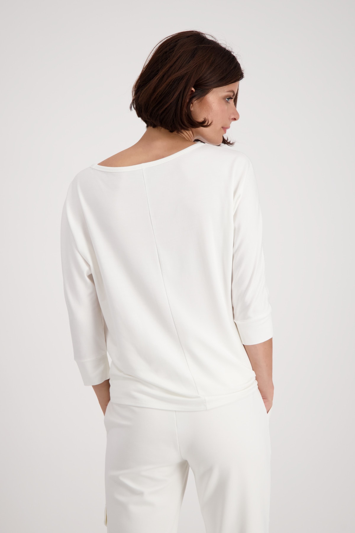 На сайте указаны российские размеры. Футболка из джерси с принтом и рукавами ¾ кремового цвета. Передняя часть этой рубашки из джерси монари украшена модным принтом с изображением двух женщин на фоне города и тигра. Работа украшена сверкающими деталями из страз. Фасон: прямого кроя со вставкой на круглом вырезе горловины, широкими манжетами на концах рукавов ¾ и объемными плечами. Изделие выглядит гламурно благодаря оверлочным швам с люрексом вдоль рукавов. Идеально подходит для хорошего самочувствия благодаря обработке струящейся вискозы, смешанной с модалом и стрейч. Модель ростом 176 см. Длина спины 44 размера составляет 62 см.