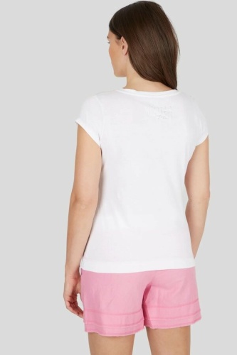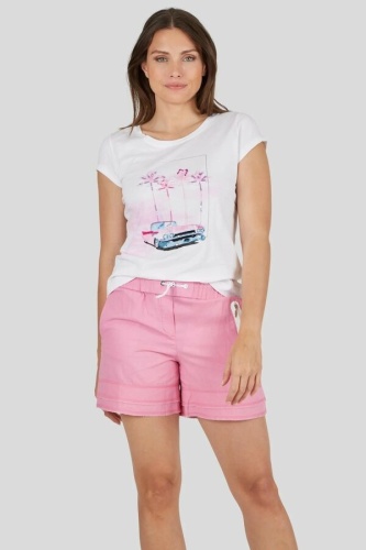 На сайте указаны Российские размеры. Классическая футболка с коротким рукавом и ипринтом с машиной и пальмами. Принт расшит различными бисером и пайетками.