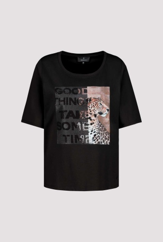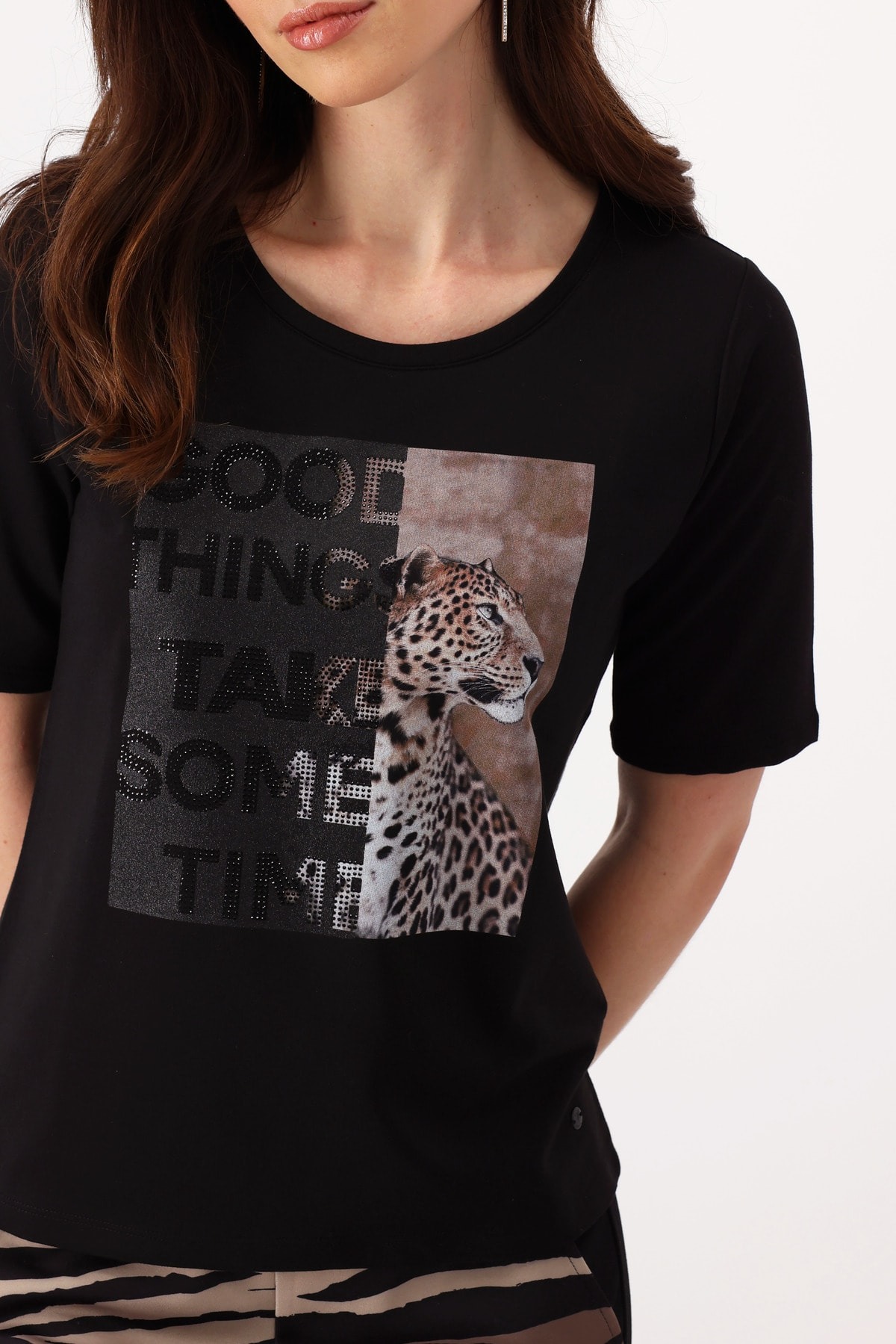 Стильная футболка из высококачественного смесового хлопка, украшенная сверкающими надписями из стразов. Круглый вырез. 1/2 руки. Длина 44 размера 62 см.