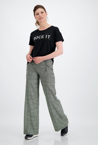 Черная футболка свободного кроя идеально сгладит недостатки фигуры и подчеркнет достоинства. Принт-надпись на груди делают футболку отличной составляющей современного кэжуал-стиля. Футболка имеет втачной короткий рукав со спущенным плечом.