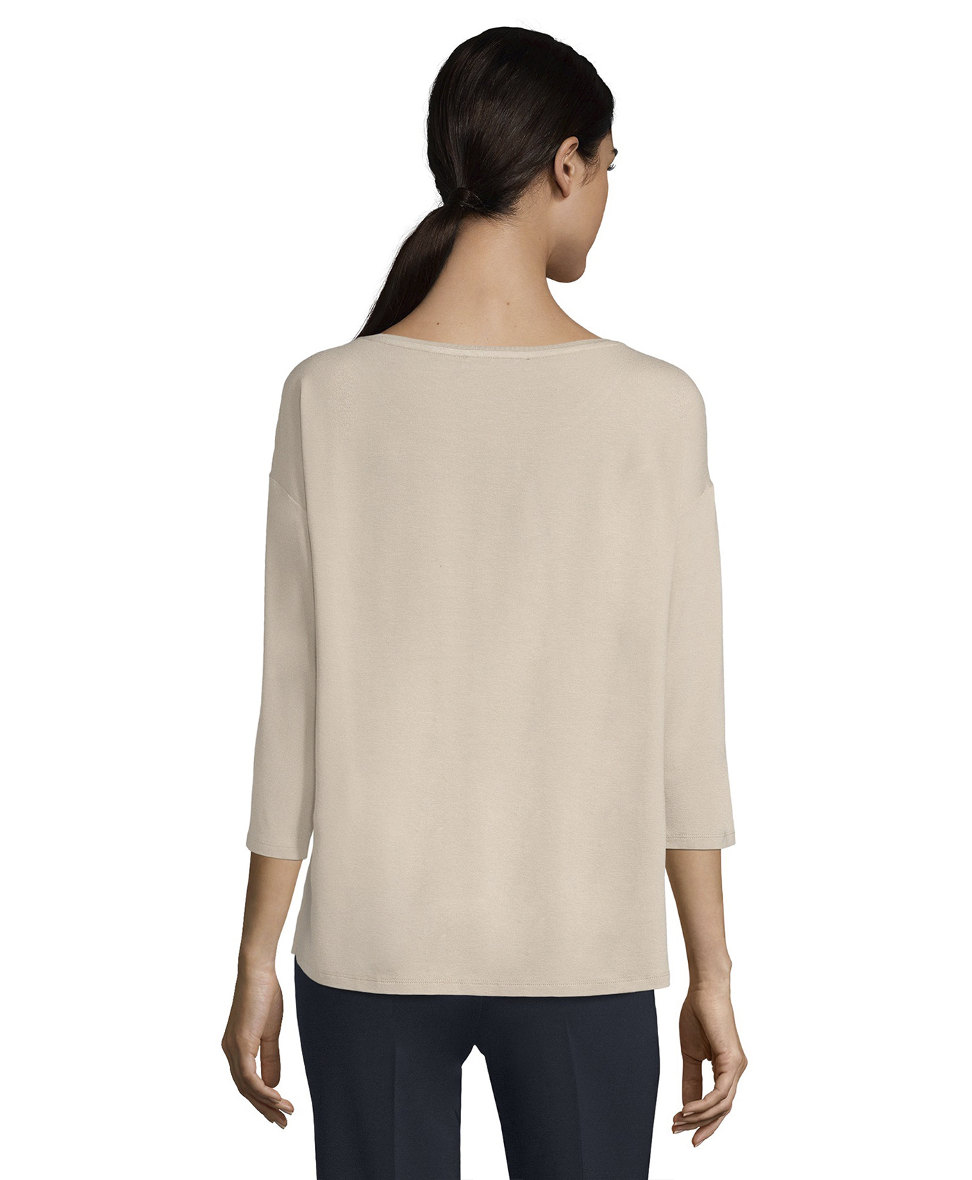 Футболка свободного покроя. Круглый вырез горловины, рукава 3/4 со спущенным плечом. Материал из вискозной смеси приятен к телу и обеспечивает комфорт. Блестящий материал переда футболки придает модели элегантный вид. Однотонная футболка является базовой вещью, поэтому отлично сочетается с любыми элементами гардероба.