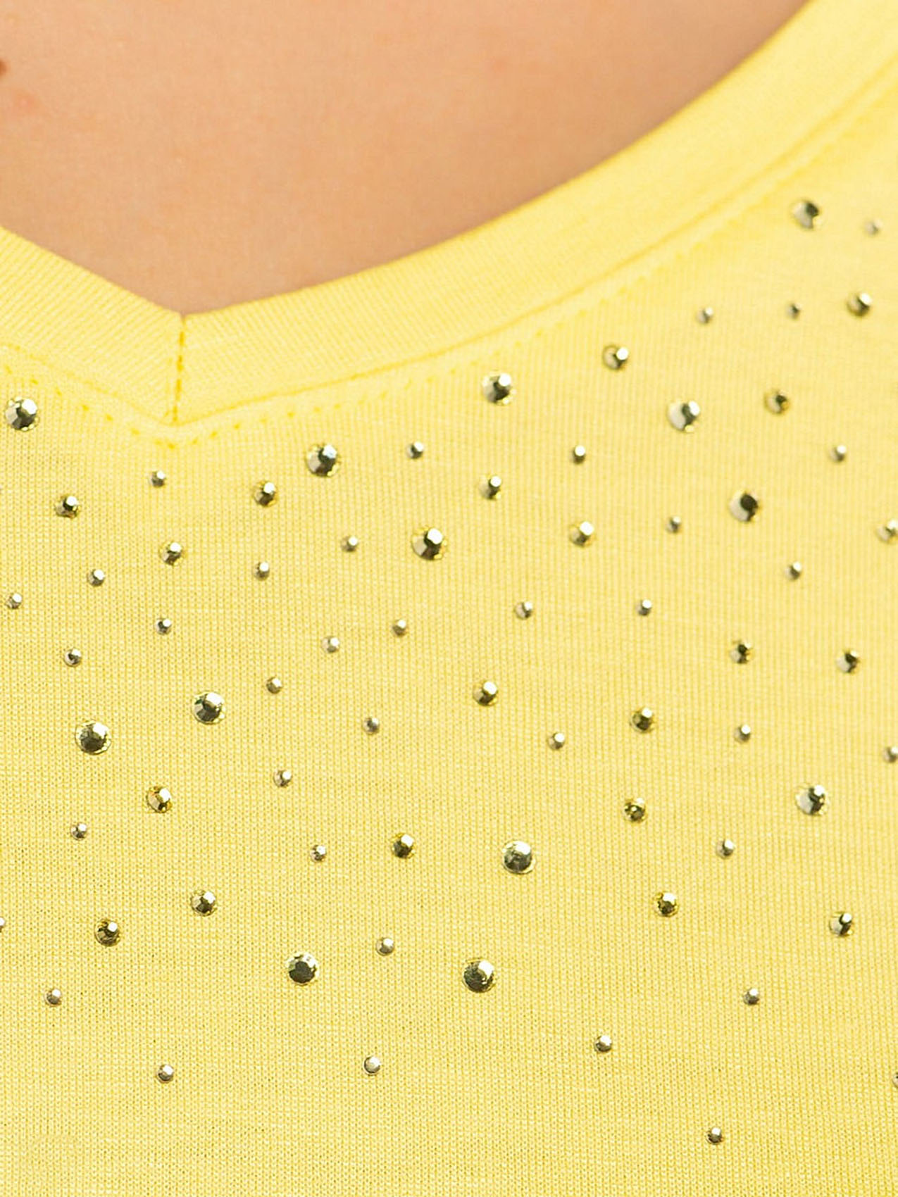 • слегка приталенный покрой • V-образный вырез • рукав 1/2 • трендовый желтый цвет • декор: стразы • приятный к телу материал из смеси вискозы и эластана