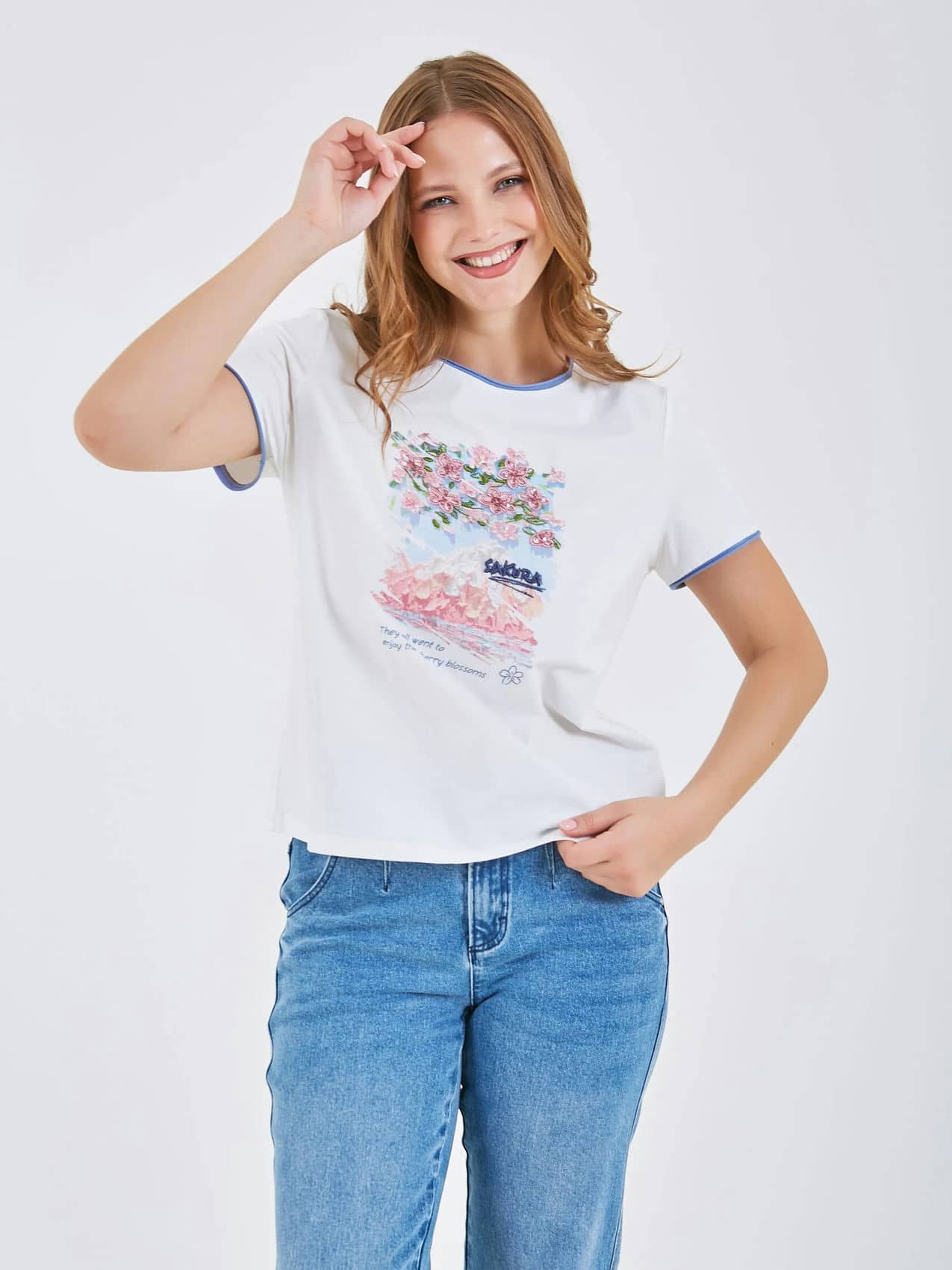 Футболка белого цвета с нежным цветочным принтом и изображением гор. Контрастные рукава и воротник голубого оттенка добавляют стильный акцент, идеально подходящий для повседневной носки. Коллекция Весна-Лето 2025. Капсула "Самарканд". Параметры модели: 95-64-101, рост 175, размер 44-46