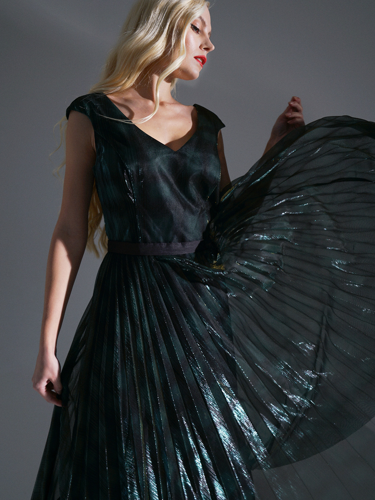 На сайте указаны российские размеры. Яркое платье-хамелеон приталенного кроя. Дина миди, вырез горловины – фигурное каре. Пояс на талии отделяет плиссированную часть платья. Отсутствие рукавов выгодно подчеркнет руки. Платье создано, чтобы притягивать восторженные взгляды на новогодней вечеринке или любом вечернем мероприятии!