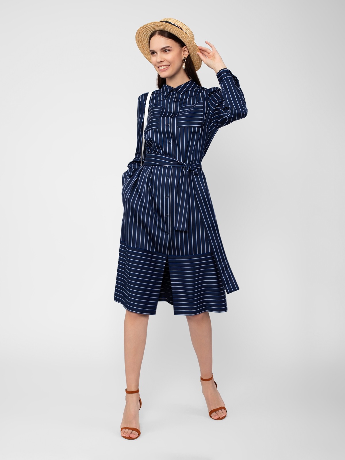 Платье в полоску длины миди прямого силуэта с классическим отложным воротником и втачным рукавом полной длины с манжетами. Спереди застежка на пуговицы и прямоугольные накладные карманы. На талии съемный пояс из основной ткани.