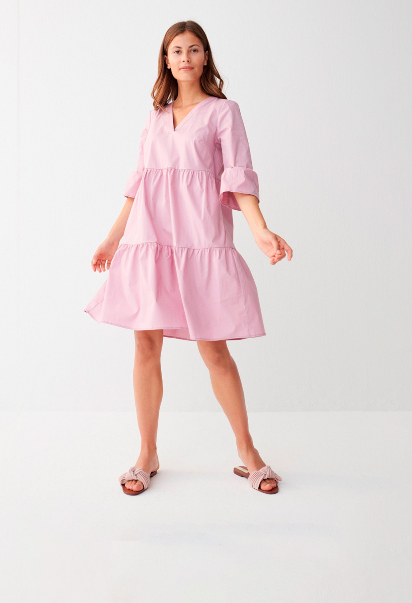 Хлопковое платье с ярусами. V-образный вырез горловиы. Длинные рукава 3/4 с воланами. Без подкладки. Длина в размере 42 = 96см