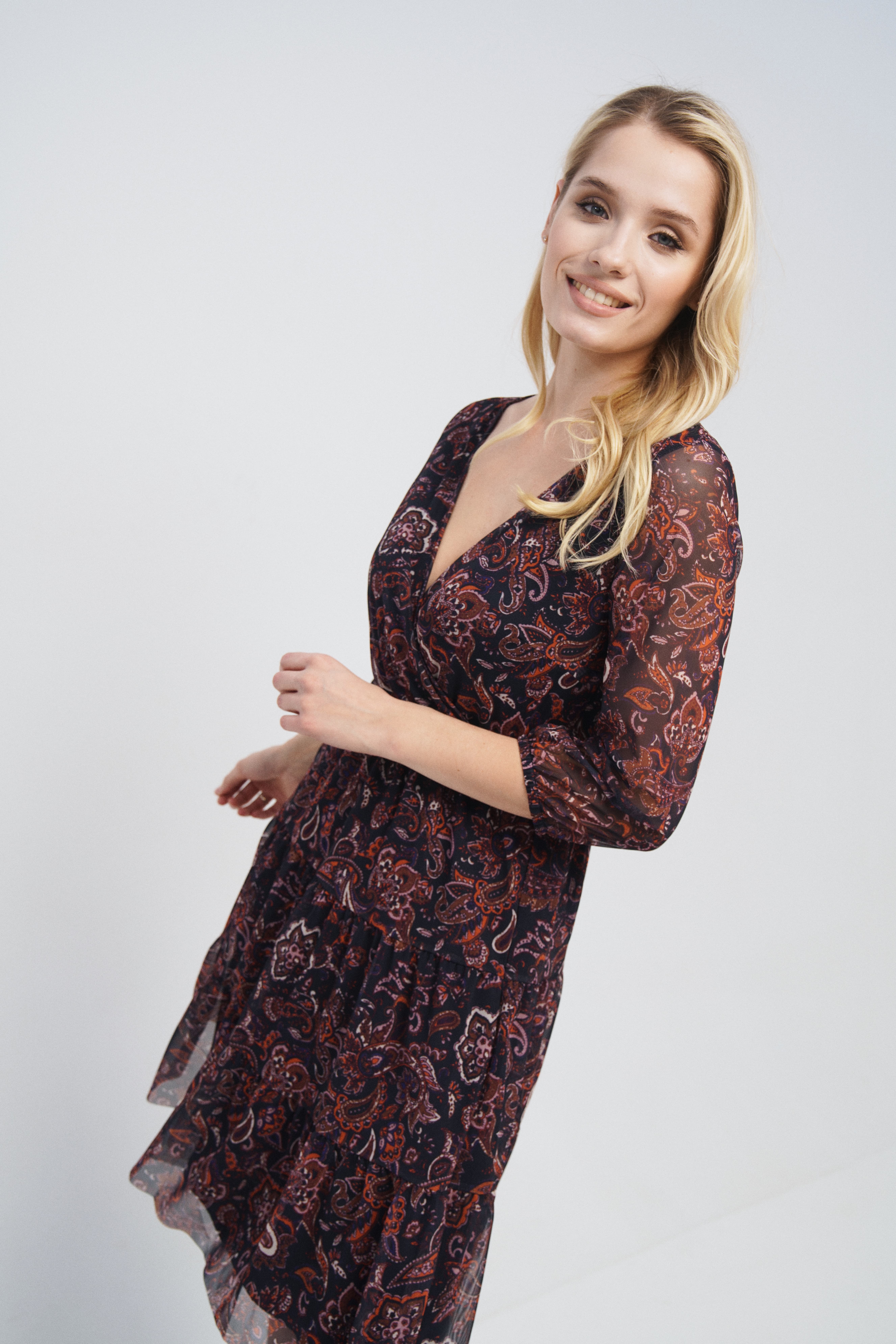 На сайте указаны российские размеры. Современное сетчатое платье от MORE & MORE с осенним принтом пейсли на темно-синем фоне. Узкий фасон вверху, расклешенный к низу. V-образный вырез и запах. Прозрачные рукава длиной 3/4 с резинкой по низу. Эластичный пояс. Юбка с широкими ярусами на подкладке из джерси. Длина в размере 42 = 96см