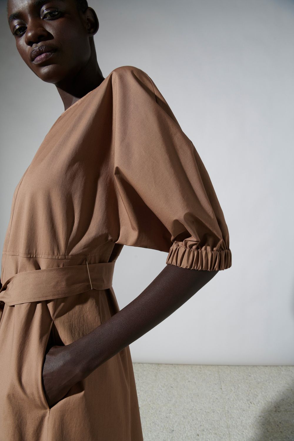 На сайте указаны российские размеры. Платье средней длины из тонкой тканой габардиновой эластичной ткани со сдержанной посадкой и расклешенным силуэтом, круглым вырезом горловины с застежкой на пуговицы и короткими рукавами с эластичной застежкой. Женственность на талии подчеркивается завязывающимся поясом. Рост модели 178 см.