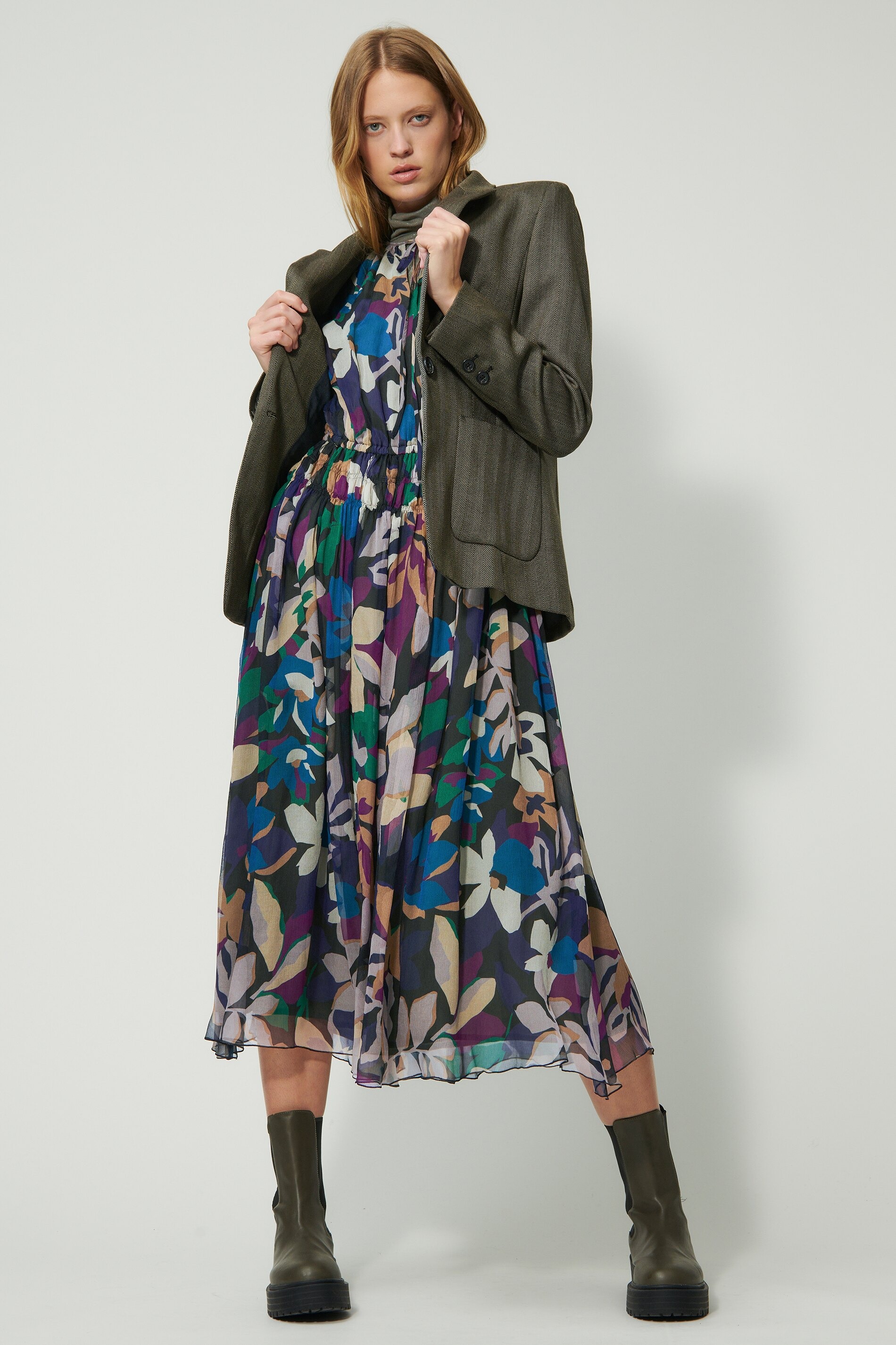 Платье на подкладке из струящегося шелкового крепа с эксклюзивным цветочным узором в зимних тонах. Круглый вырез горловины завязан лентой. Талия и манжеты украшены декоративной сборкой.