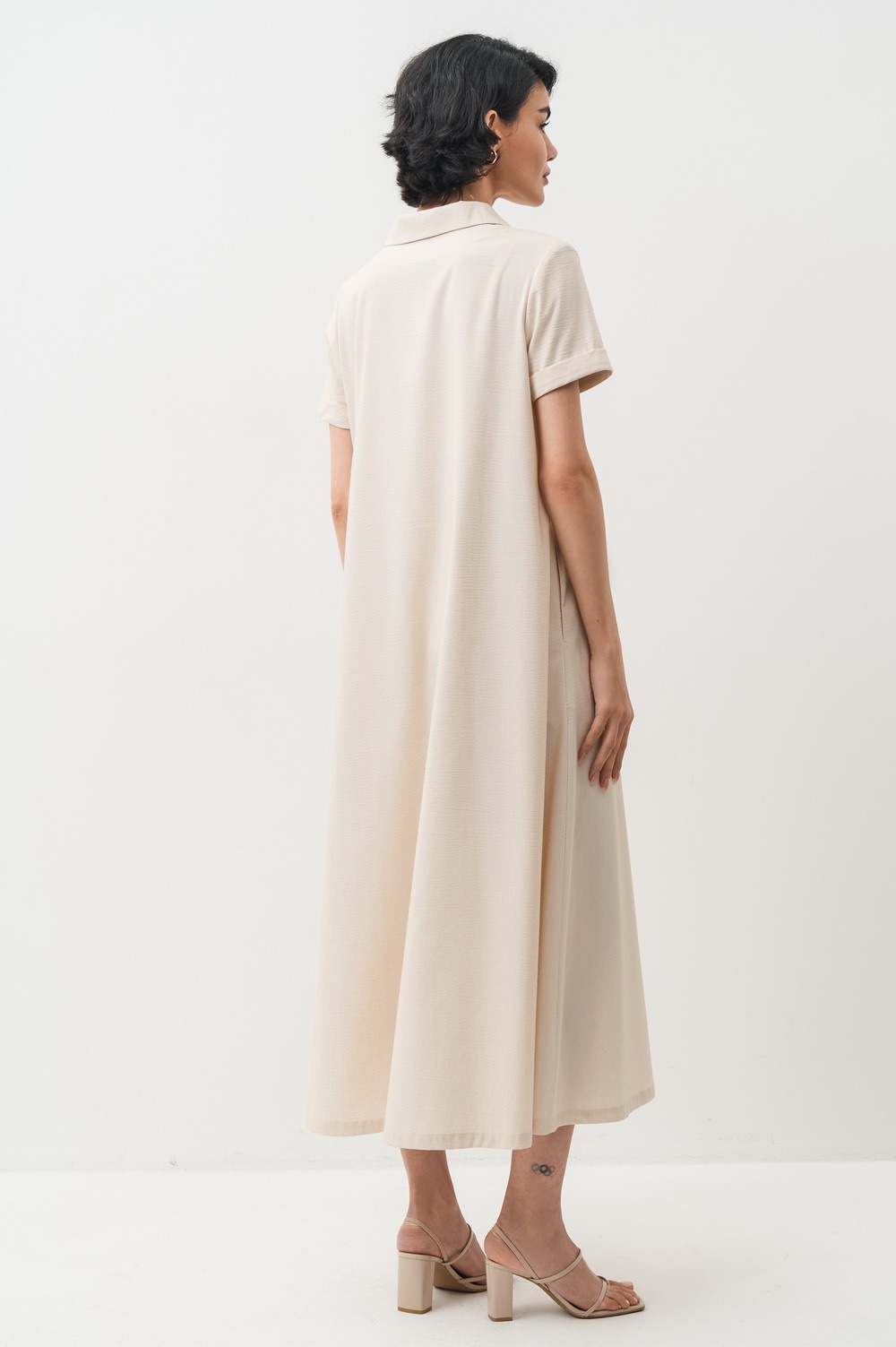 Платье А-образного силуэта. По горловине, до уровня талии, планка с лацканами. Воротник - отложной. Рукав с притачной манжетой-отворотом. Карманы в боковых швах.