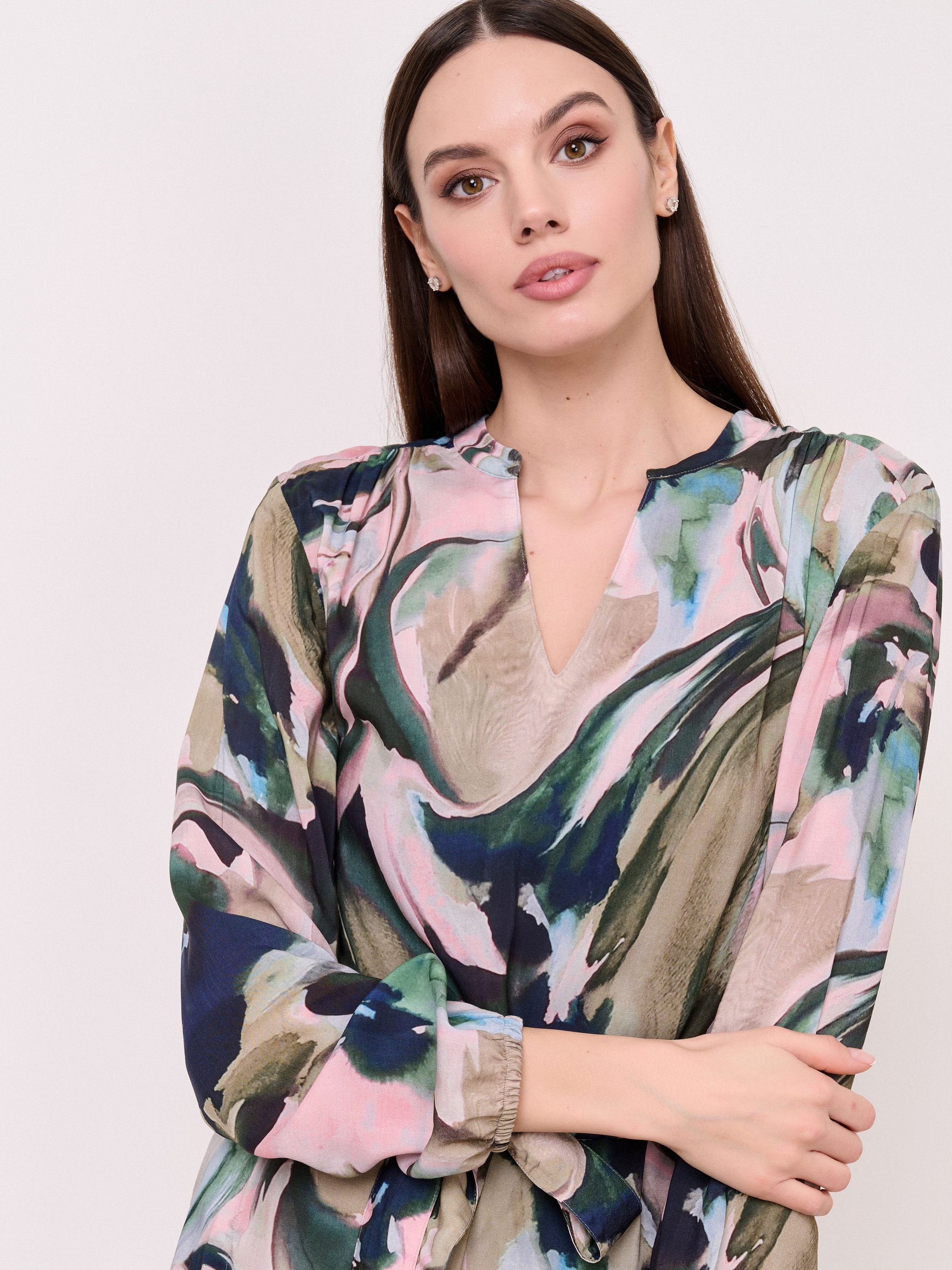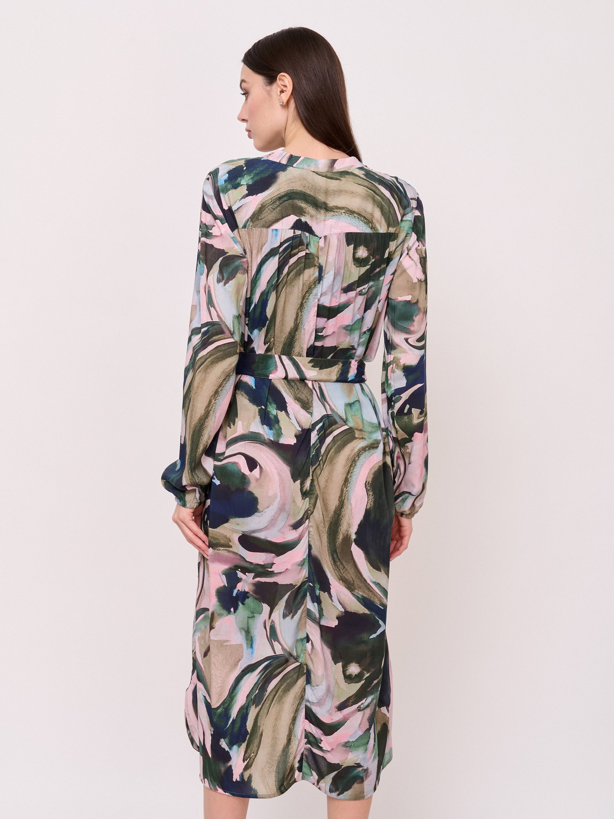 Детали: без застежки, вырез горловины замочная скважина, рукава длинные, покрой прямой, рисунок абстракция, карманы в шве, конструктивные элементы боковые разрезы, длина платья миди, пояс из основной ткани. Длина по спинке: 117 см.