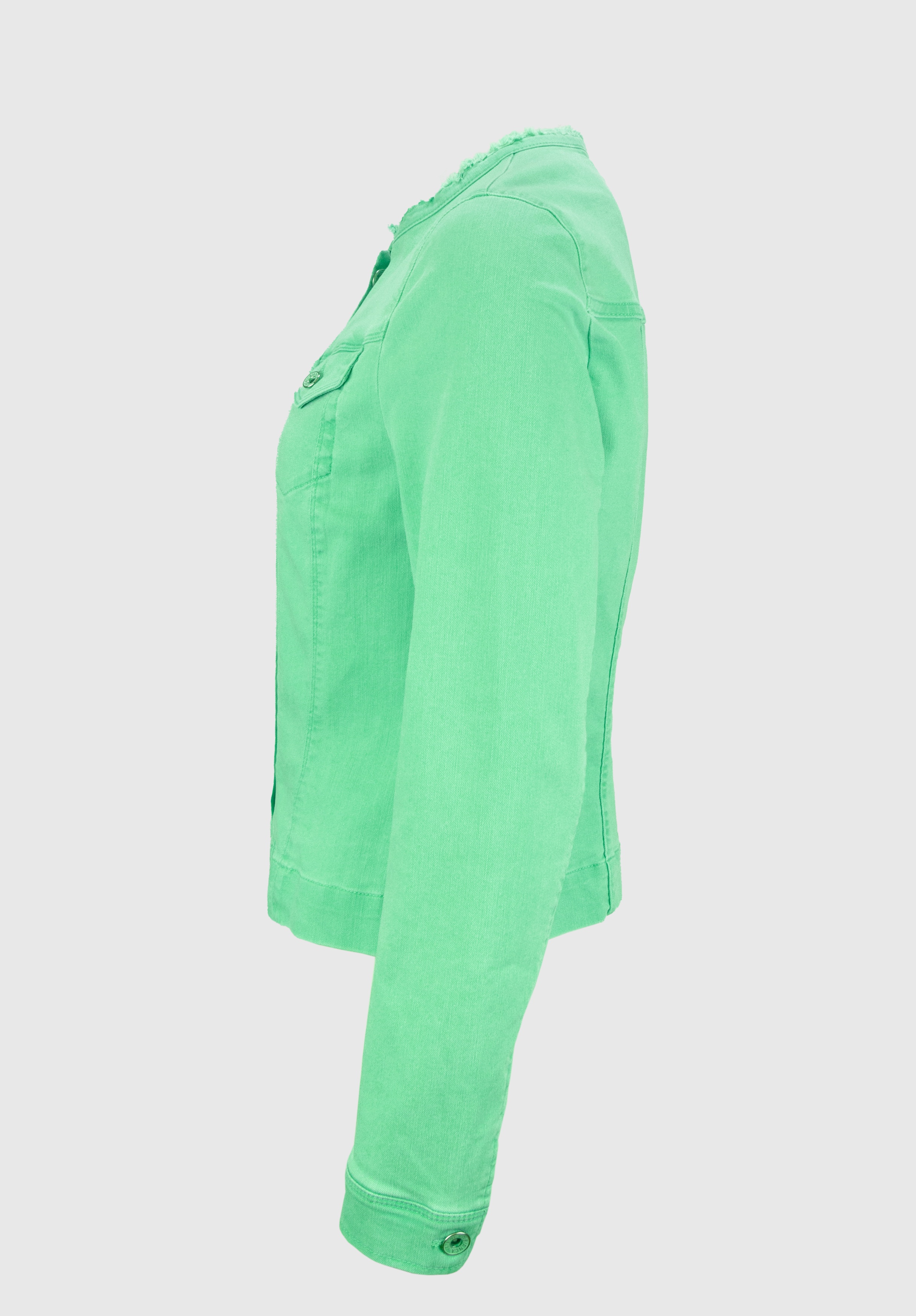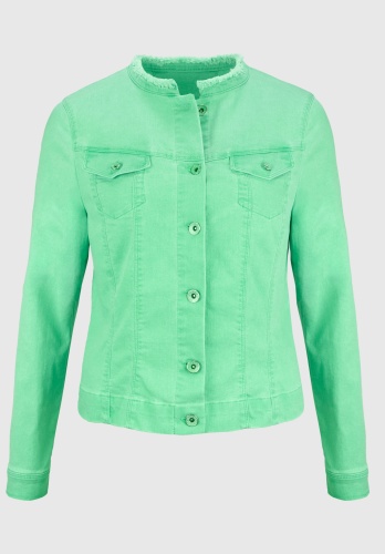 На сайте указаны российские размеры. Джинсовая куртка с особым воротником с бахромой. Благодаря сочетанию высококачественных материалов с эластичным эластаном, она очень удобна в носке и повторяет каждое движение. Планка на пуговицах спереди и особый воротник с бахромой, а также накладные нагрудные карманы делают эту модель абсолютно привлекательной. Длина в размере 44 около 54 см.