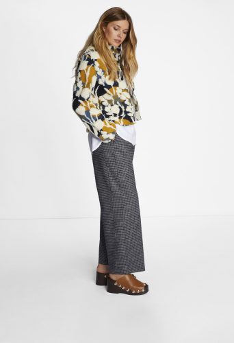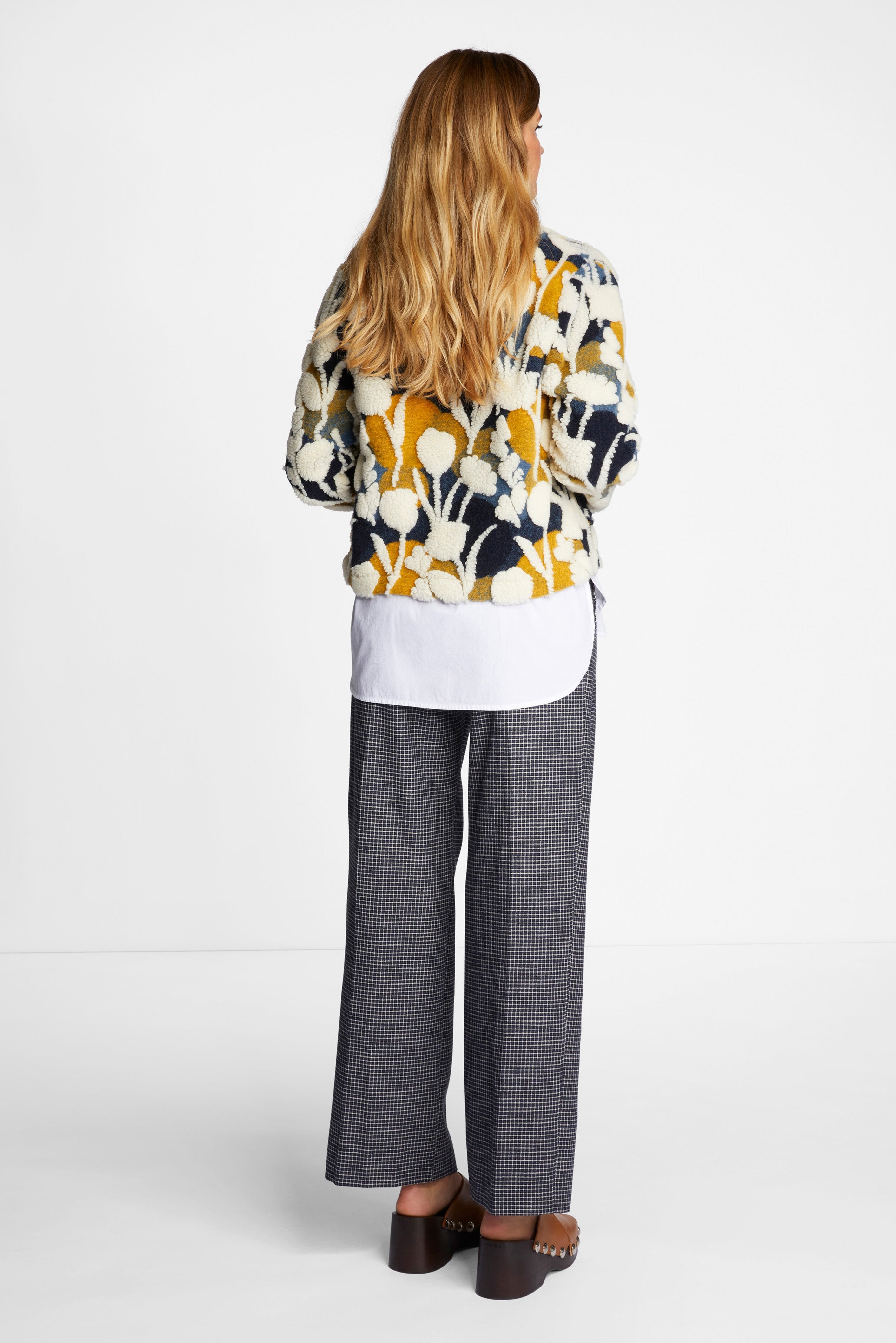Плюшевая куртка с цветочным узором имеет удобный прямой крой. Он изготовлен из букле и мягкого плюшевого материала. Пуговицы приклеены, карманы пристрочены. Длина для размера 42: 56 см.