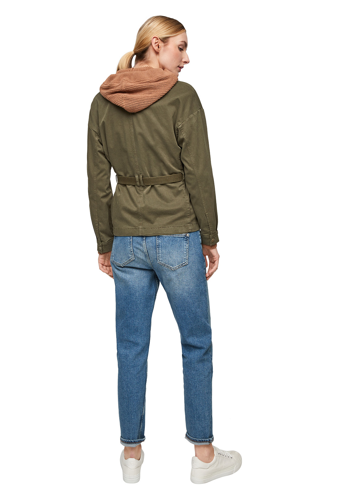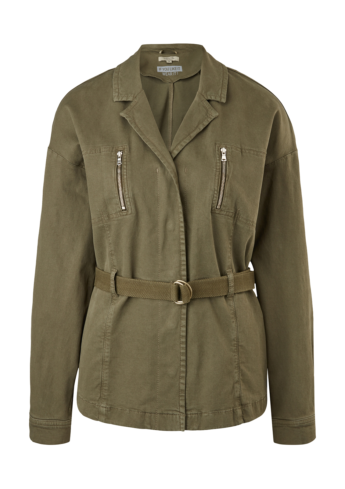 Куртка цвета хаки завершит стильный городской образ. Отложной пиджачный воротник, застежка на клепки. Накладные карманы на молнии на груди. В комплекте идет пояс из основной ткани куртки.