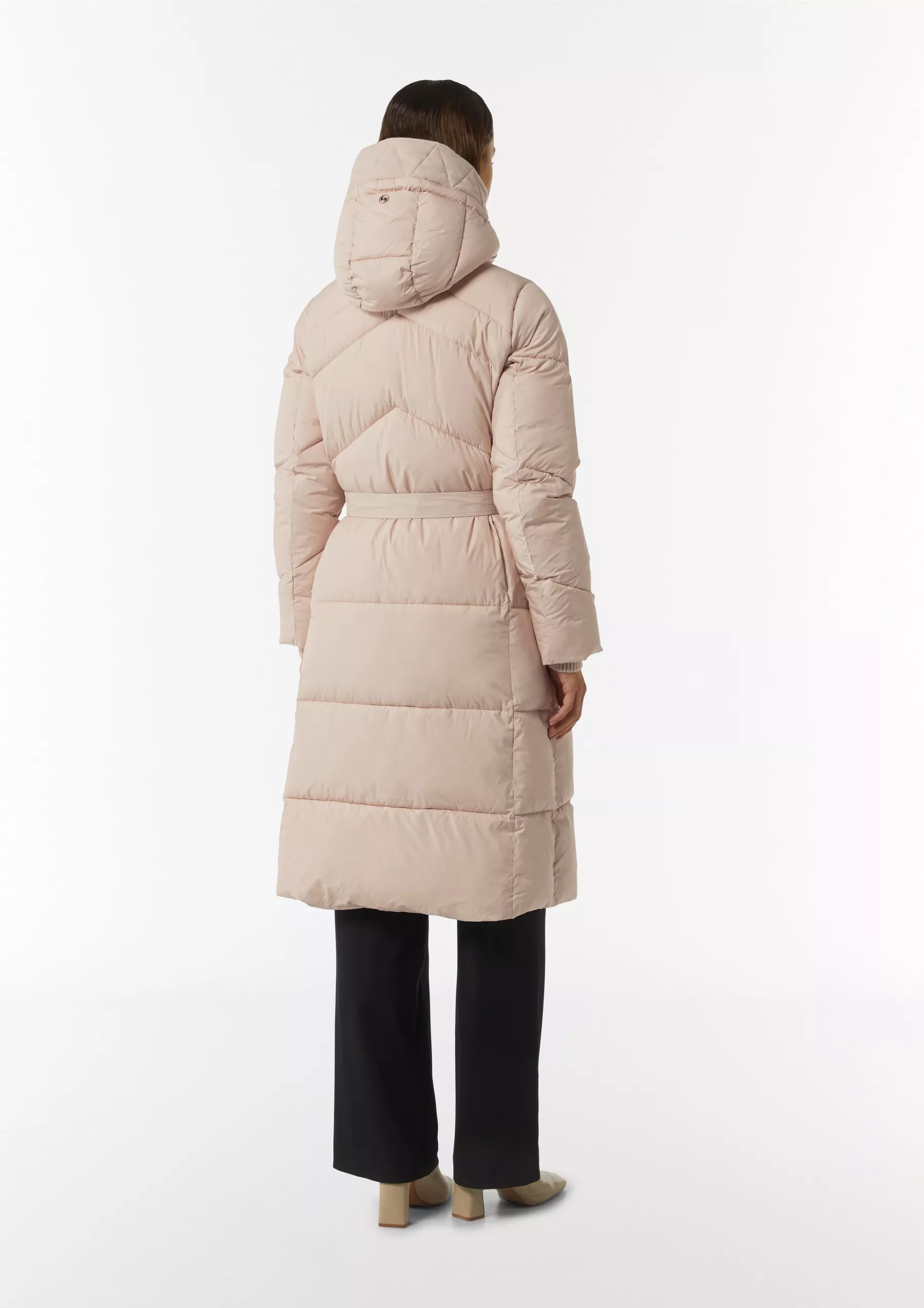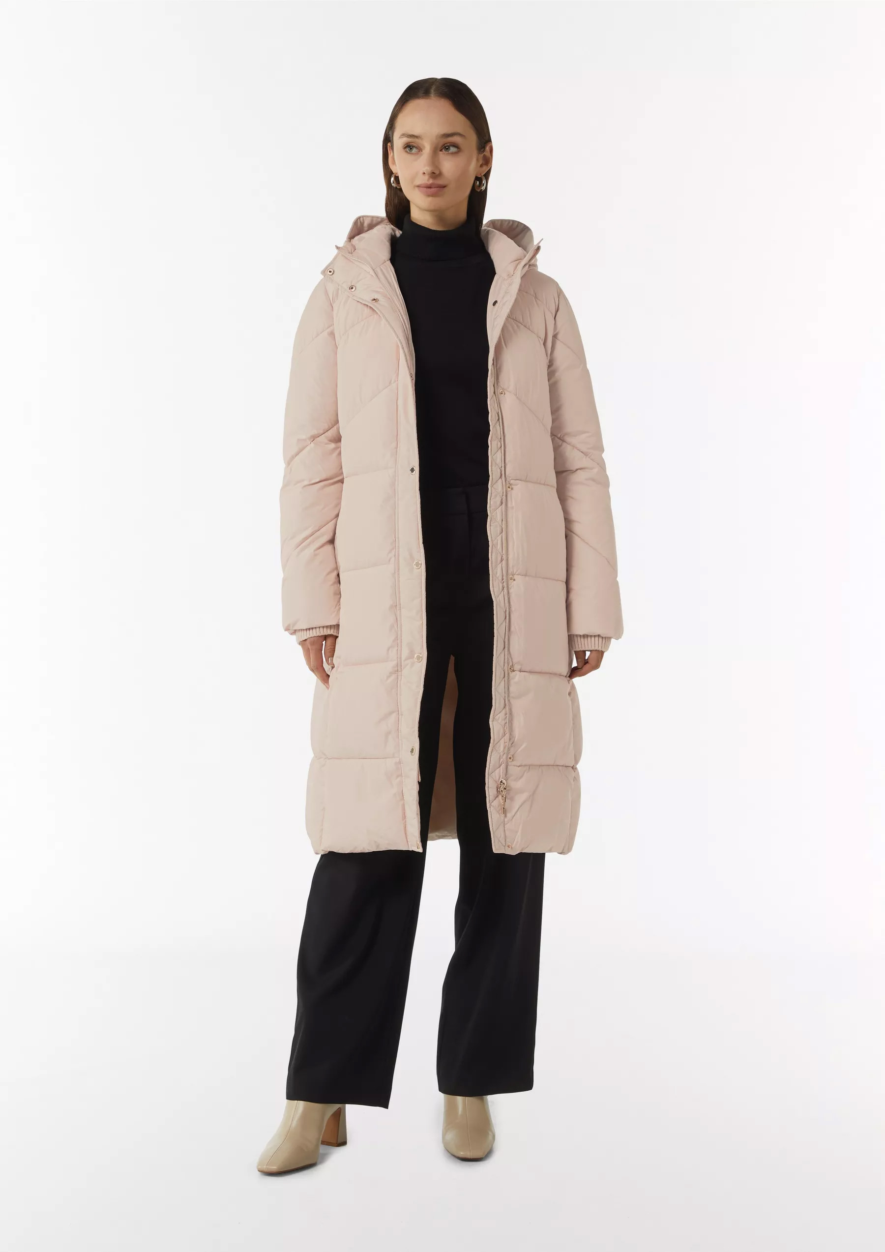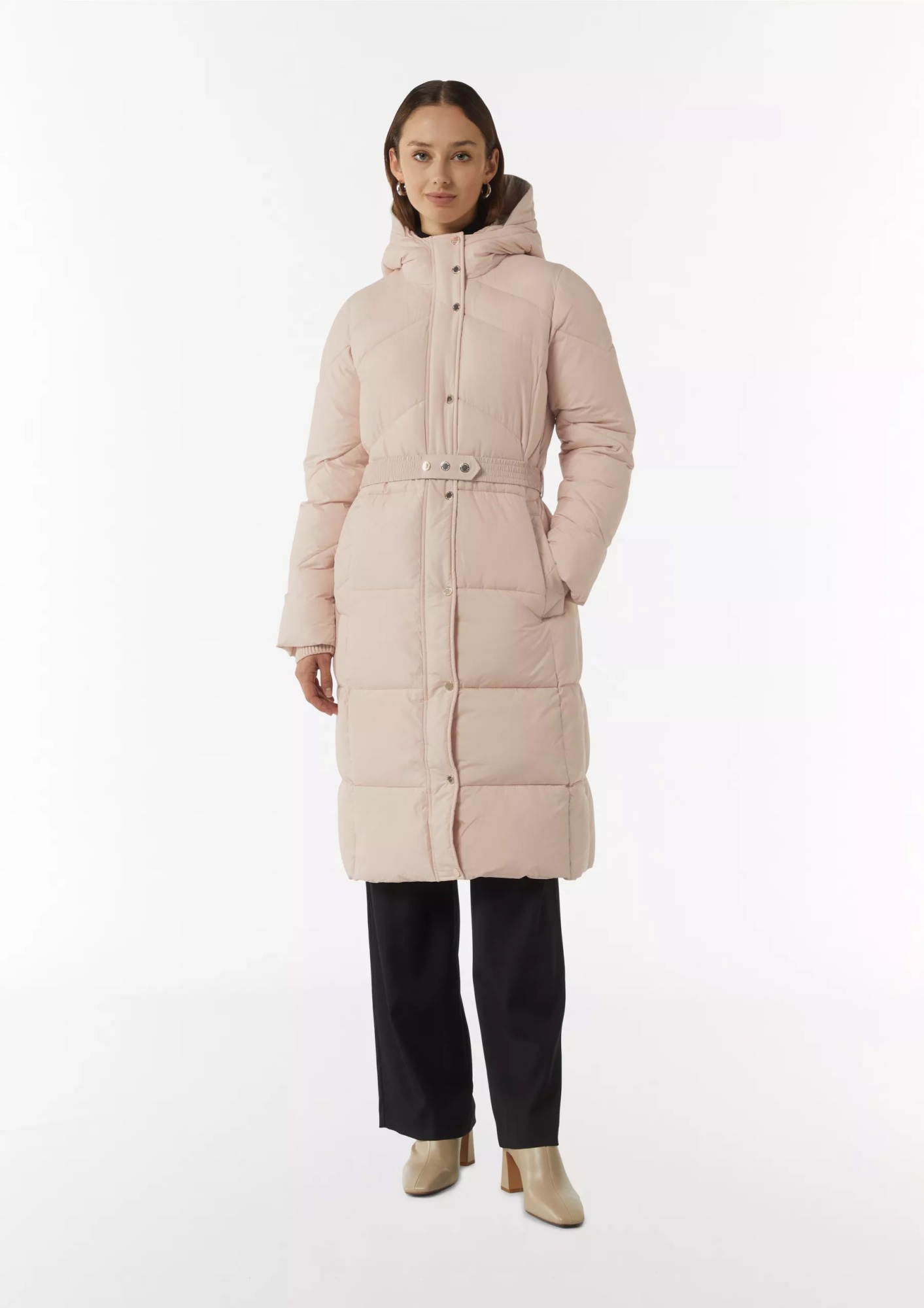 Стильное стеганое пальто COMMA с параллельными и диагональными швами, и с фиксированным капюшоном, обеспечивает превосходную защиту от непогоды. Скрытая двухсторонняя молния и планка на кнопках обеспечивают удобство ношения, а воротник-стойка добавляет нотку изысканности. Шлевки для ремня и текстильный пояс позволяют затянуть талию для создания привлекательного силуэта. Идеально подходит для повседневных прогулок в прохладную погоду.
