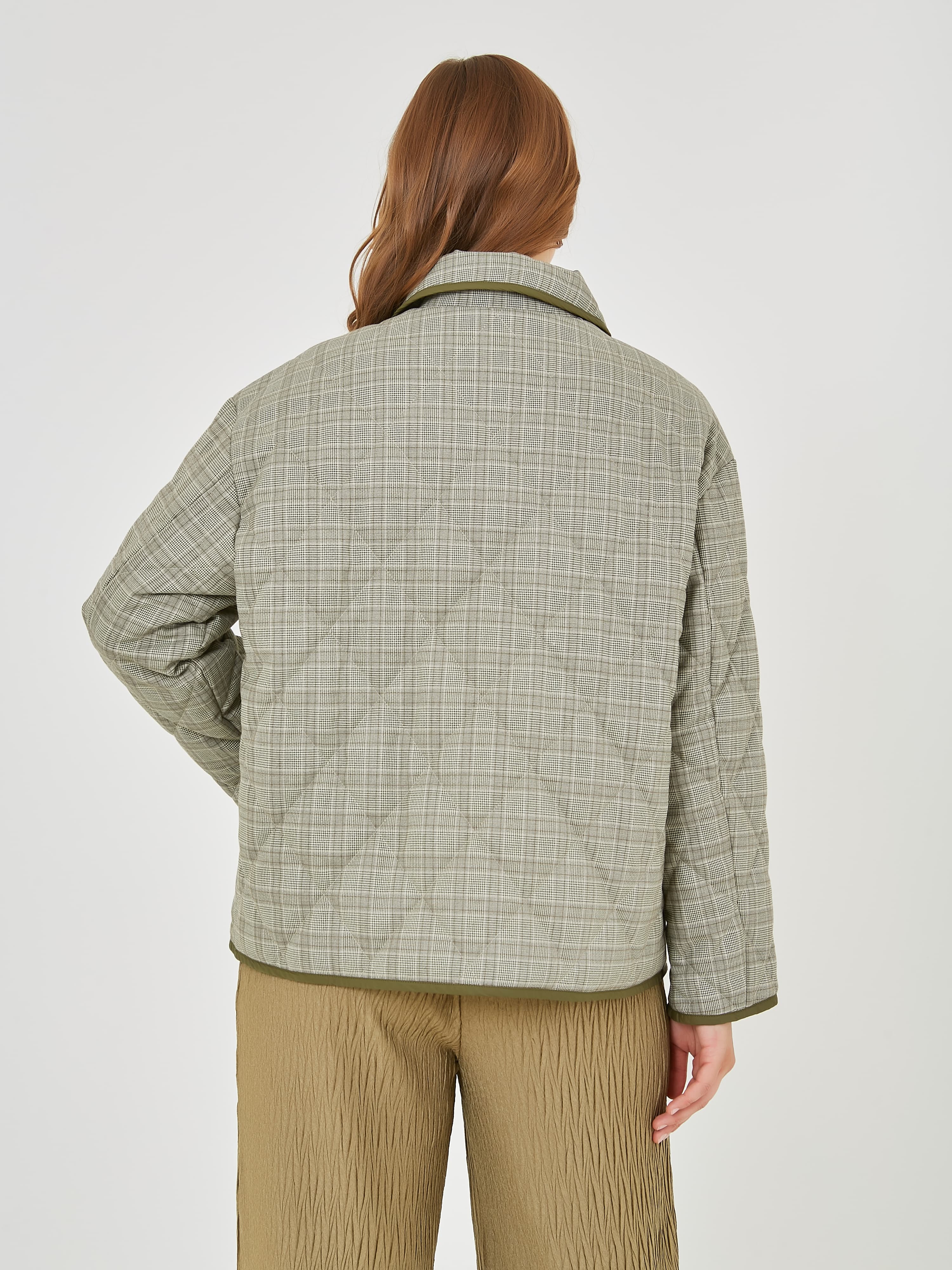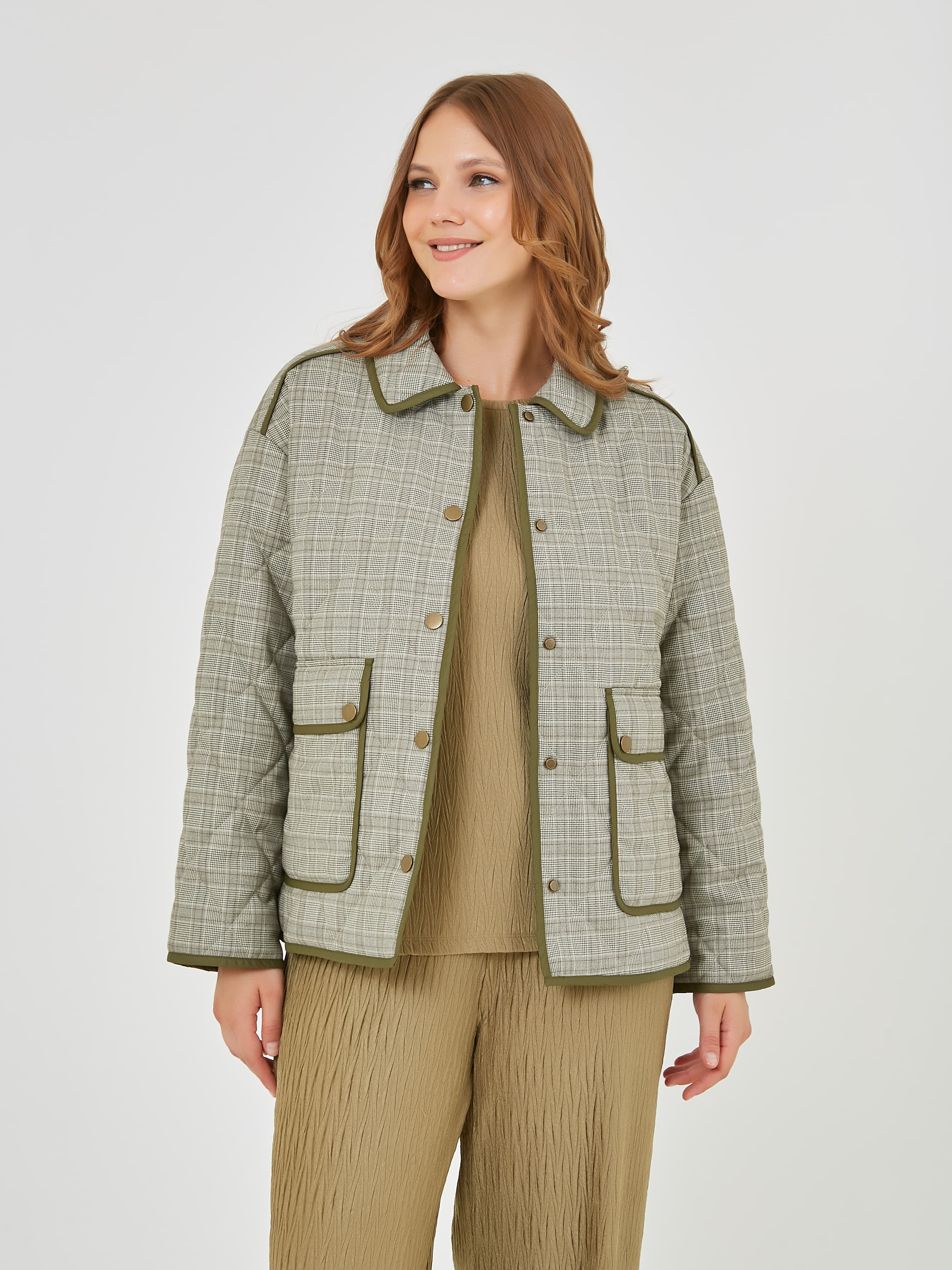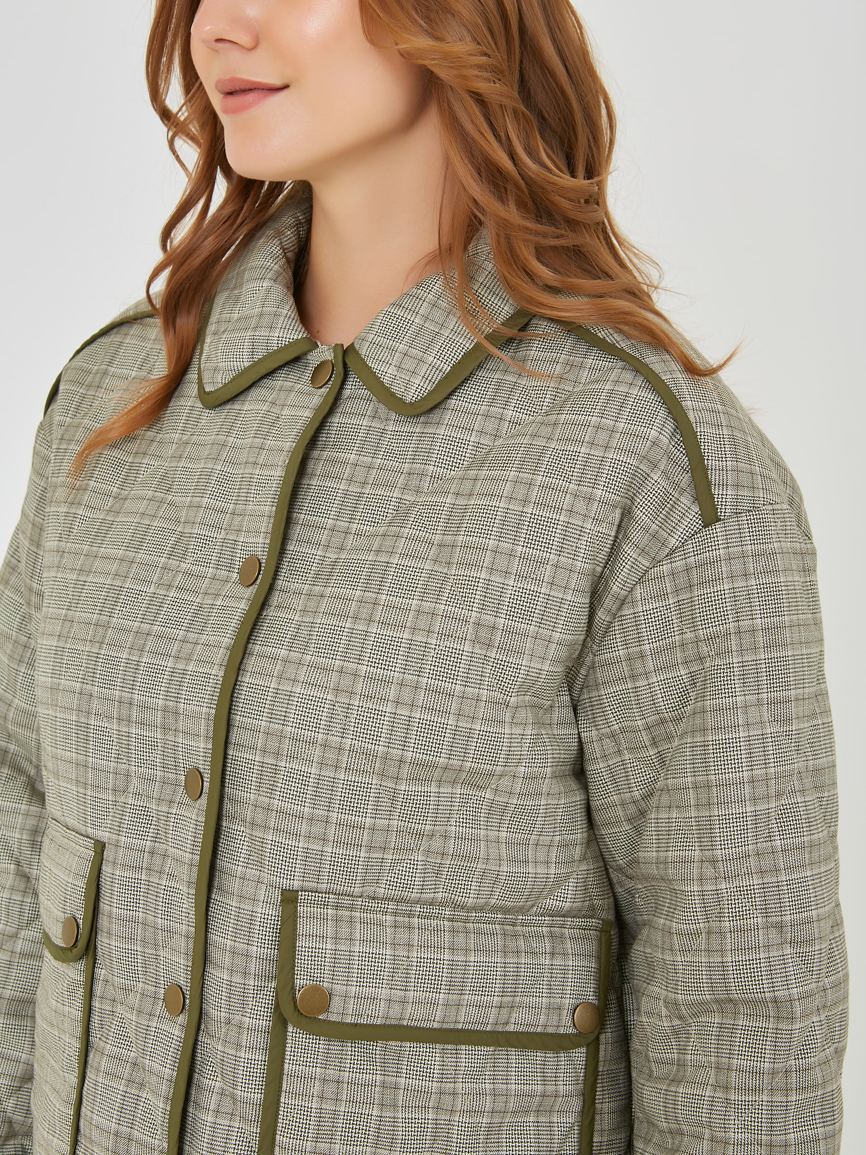Куртка имеет стильный клетчатый узор в зеленых и серых тонах, что добавляет ей современный вид. Оформление с контрастной отделкой, застежками на кнопках и карманами придает ей функциональность и уют. Коллекция Весна-Лето 2025. Капсула "Марракеш". Параметры модели: 95-64-101, рост 175, размер 44-46