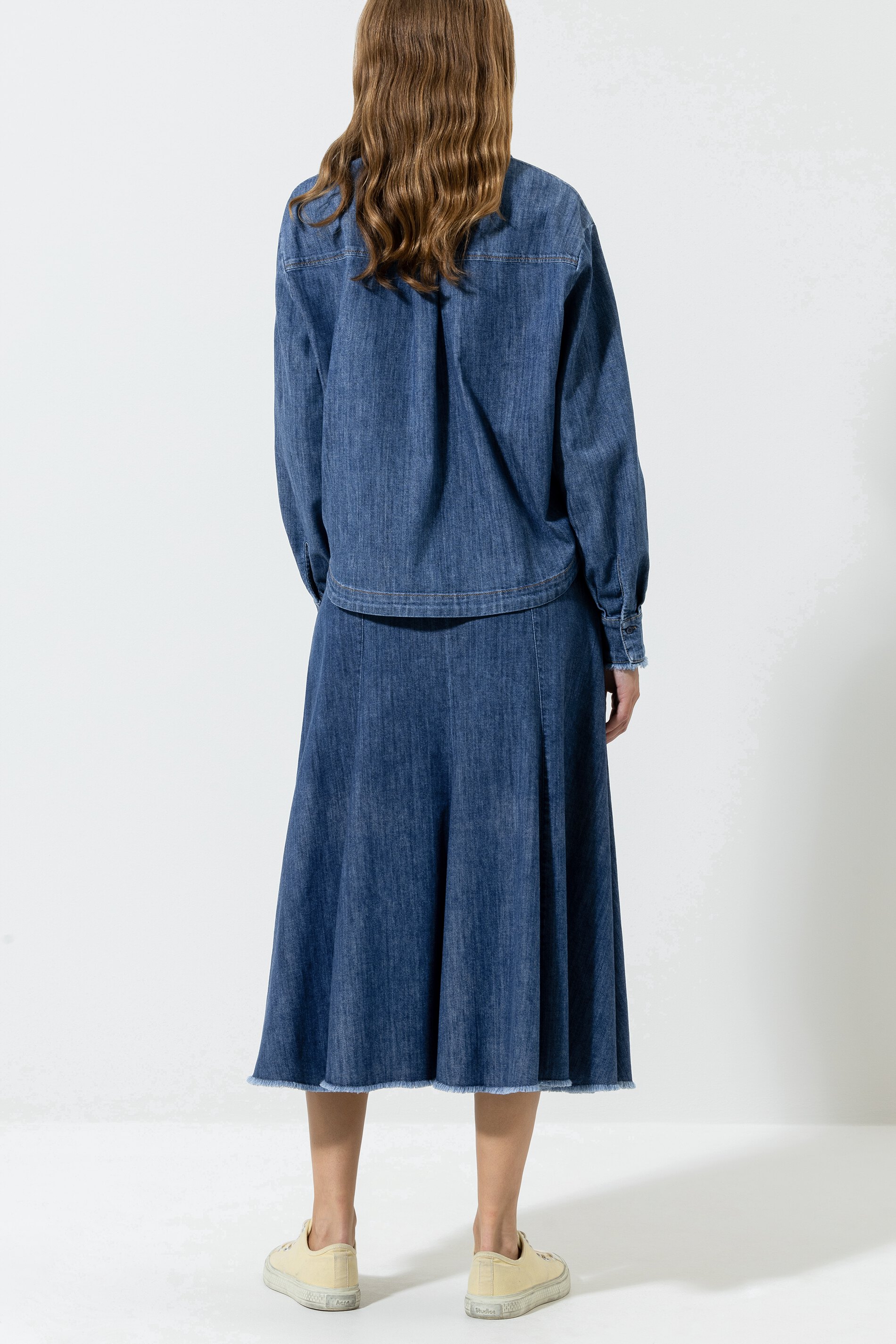 На сайте указаны российские размеры. Юбка-годе средней длины из натуральной легкой эластичной джинсовой ткани с эффектом потертости и молнией сзади. Нижний край украшен тонкой бахромой. Рост модели 178 см