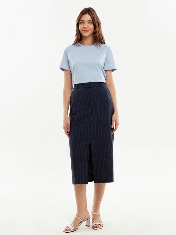 Прямая юбка длины миди, на талии с гульфиком по центру, на притачном поясе со шлевками. Разрез спереди по центру. Юбка из 100% хлопковой костюмной ткани в тонкую полоску. Рабочие карманы по бокам.