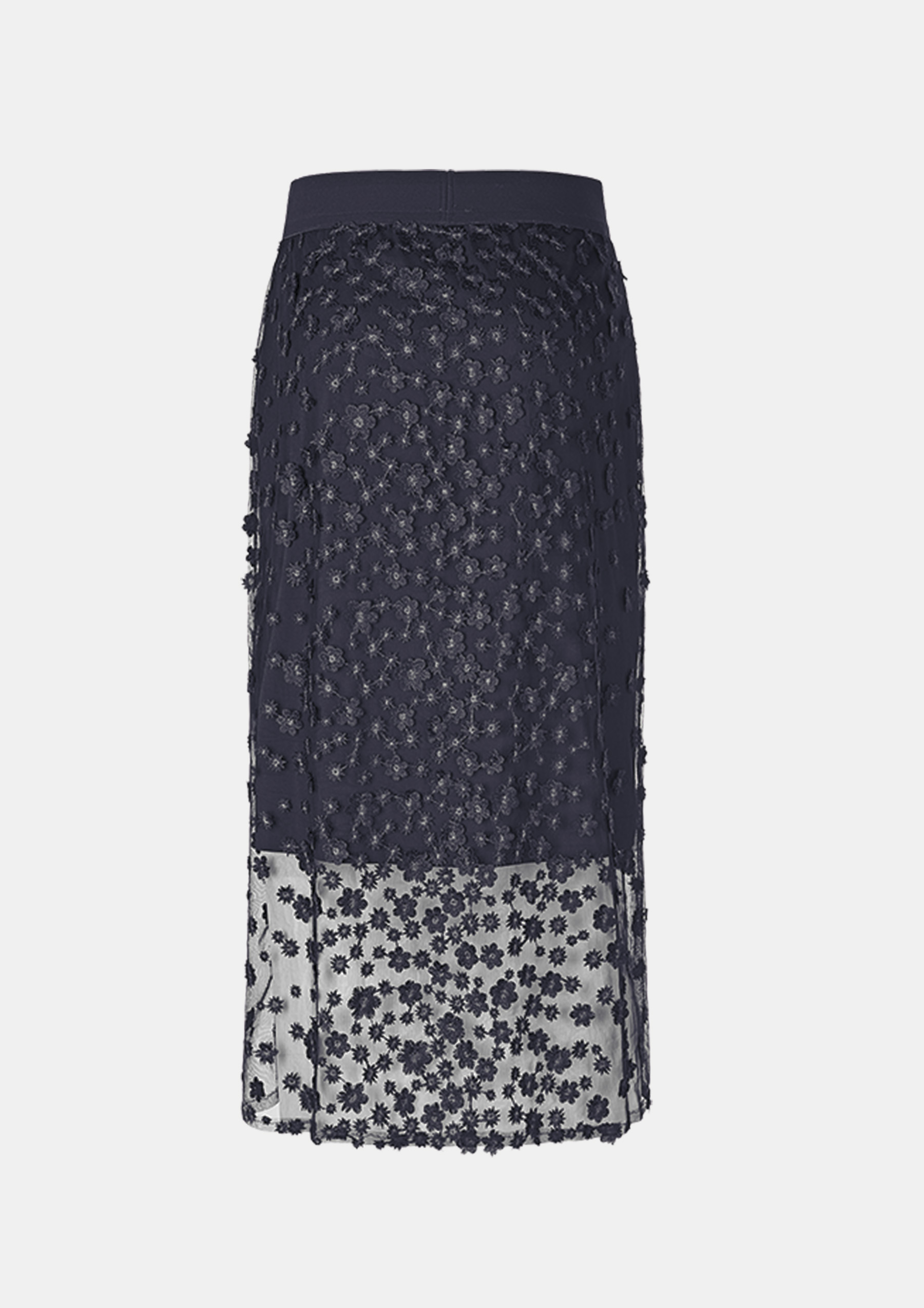 Юбка-миди с замысловатой объемной цветочной вышивкой, которая поднимет вам хорошее настроение. Юбка-комбинация прямого кроя изготовлена из тонкого черного тюля, который в сочетании с синими объемными цветами создает красивый глубокий синий цвет.