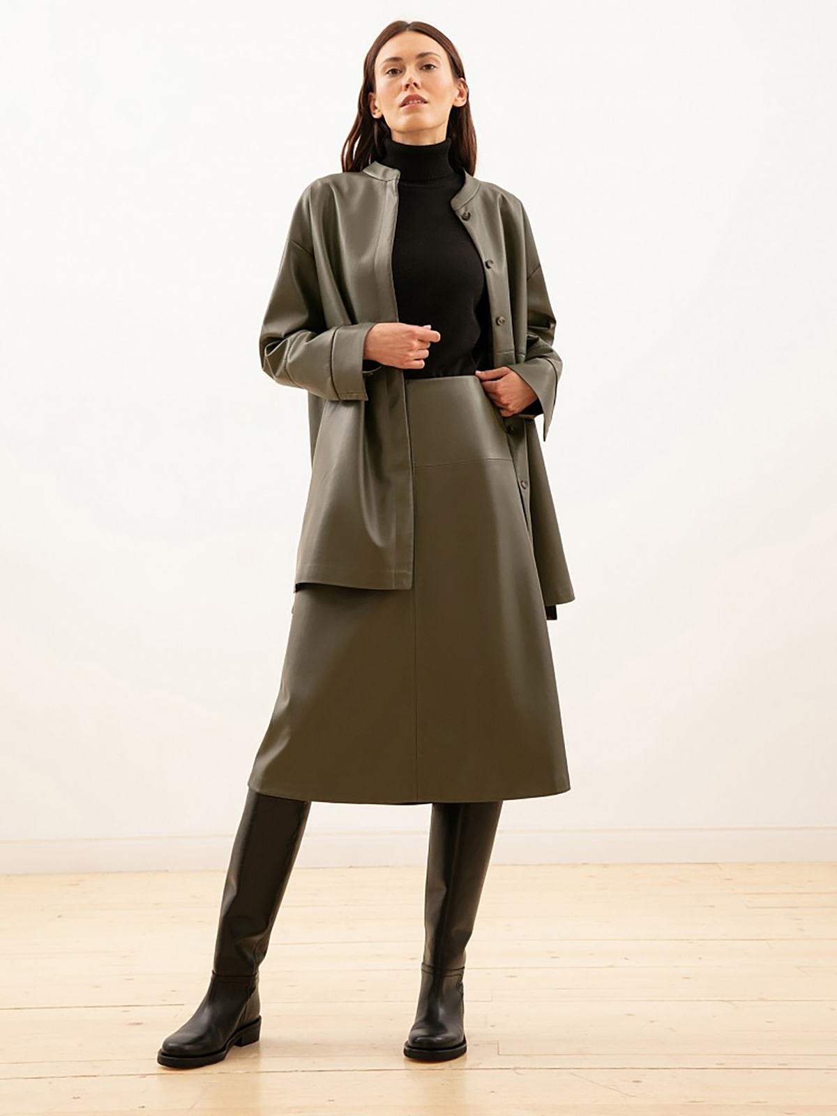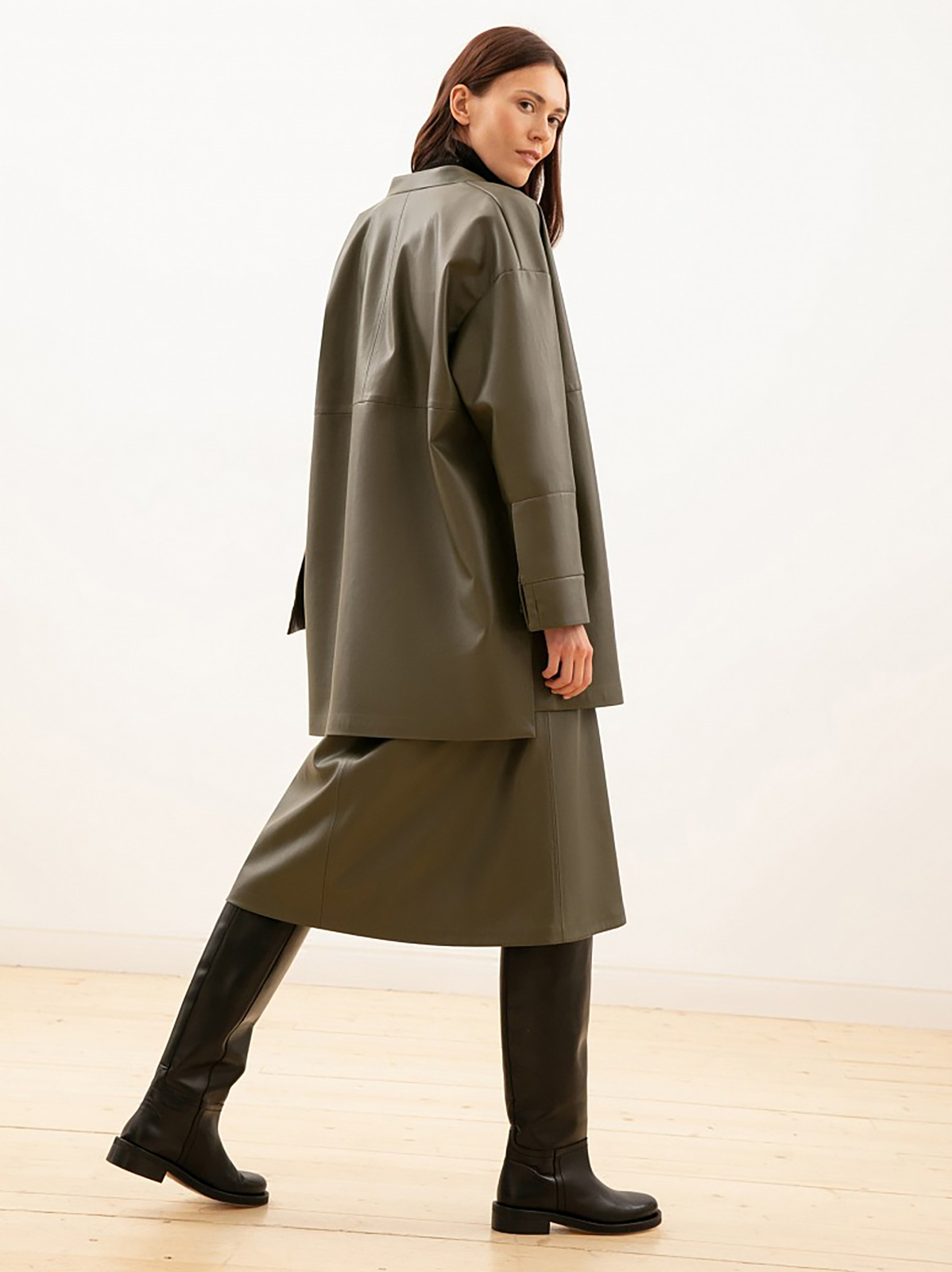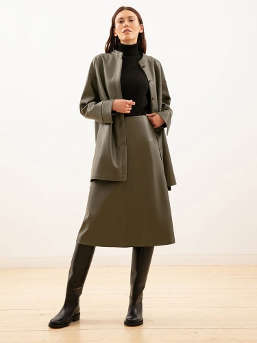 Жакет свободного силуэта из экокожи цвета хаки. Воротник-стойка, супатная застежка на пуговицы. Спущенная линия плеч, длинные рукава с манжетами.