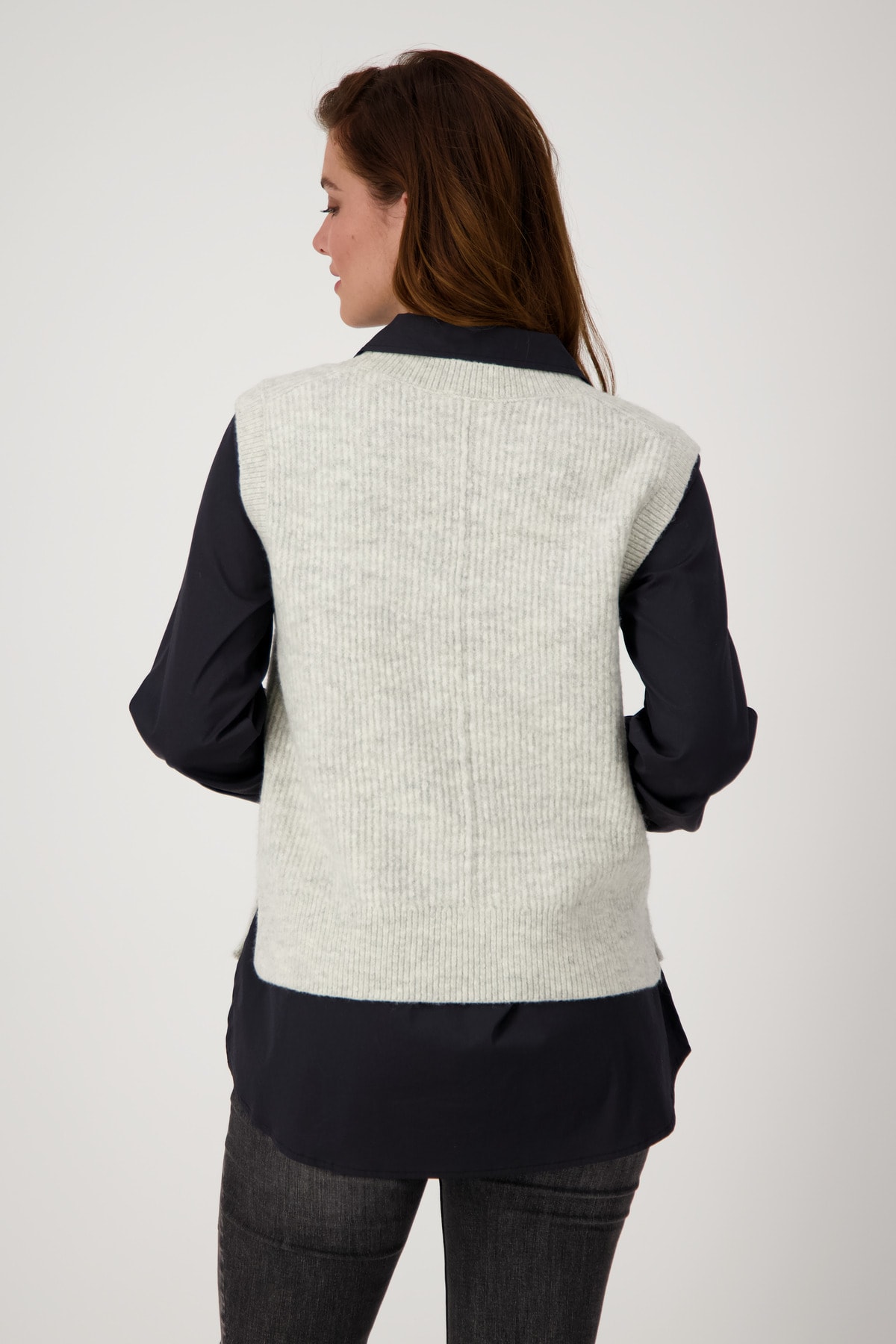 На сайте указаны российские размеры. Жилет гладкой вязки с круглым вырезом. Прямой фасон без рукавов с круглым вырезом горловины, широкими манжетами на кромке и на указанных концах рукавов, а также прохладными боковыми разрезами определяют внешний вид этой довольно простой модели свитера. Модель ростом 179 см.
