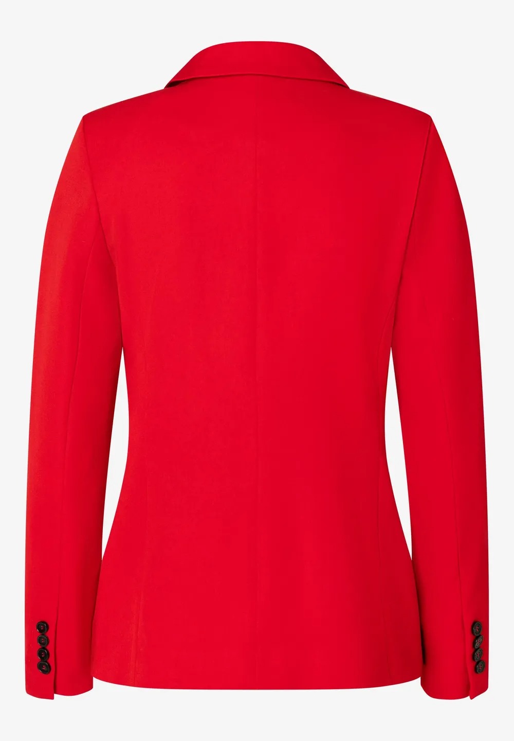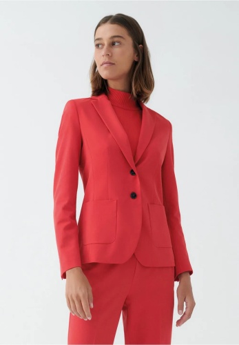 Женственный пиджак на двух пуговицах от MORE & MORE ярко-красного цвета создает современный деловой образ с соответствующими брюками. Но он также отлично сядет по фигуре в сочетании с повседневными джинсами или женственным шифоновым платьем. Воротник с лацканами, накладные карманы. Длина по размеру 42 = 62см