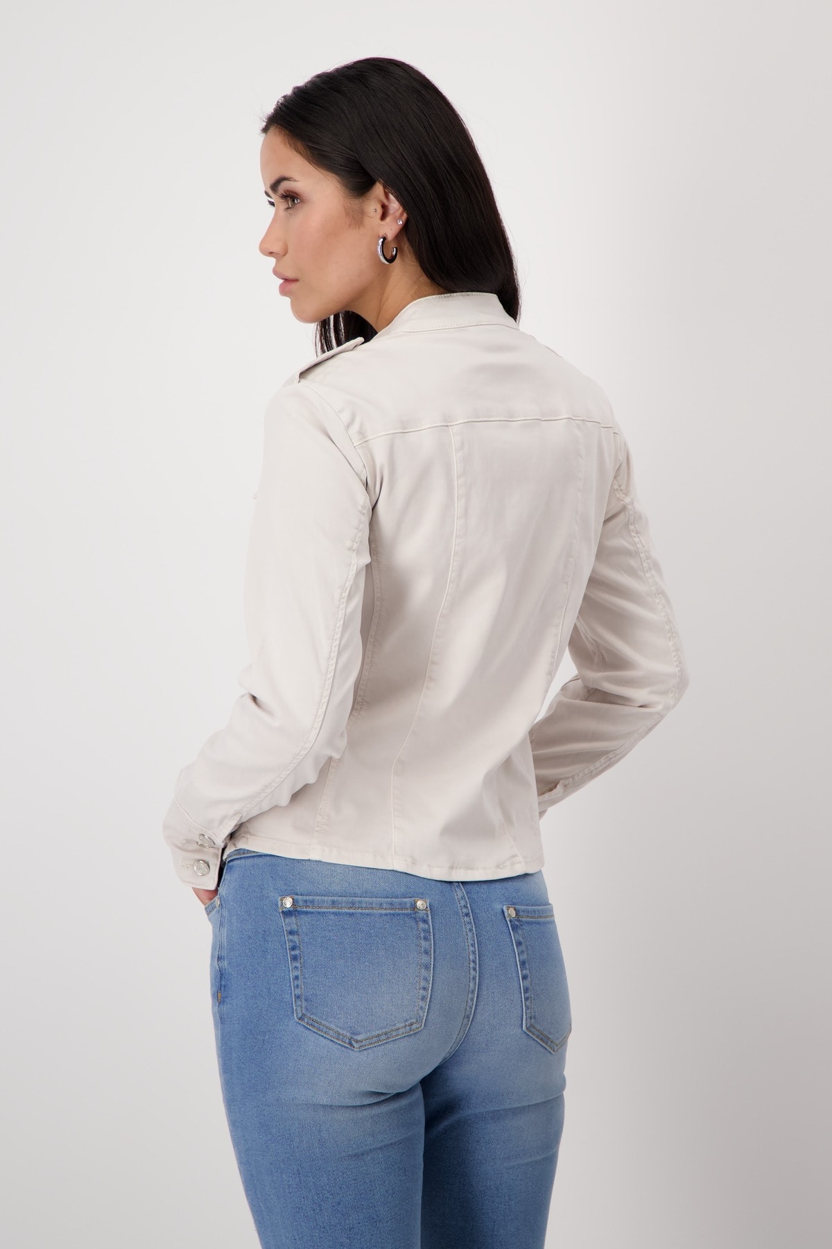 Стильная куртка из мягкого смесового лиоцелла с карманами с клапанами и бретелями, украшенная декоративной пуговицей. Эластичный материал. Регулярная посадка. Воротник-стойка и бретели с декоративными пуговицами. Длинные рукава с манжетами. Накладные карманы с клапанами на уровне груди. Удлиненная, закругленная передняя часть. Длина 44-го размера по спинке — 57 см, длина по переду — 59 см.