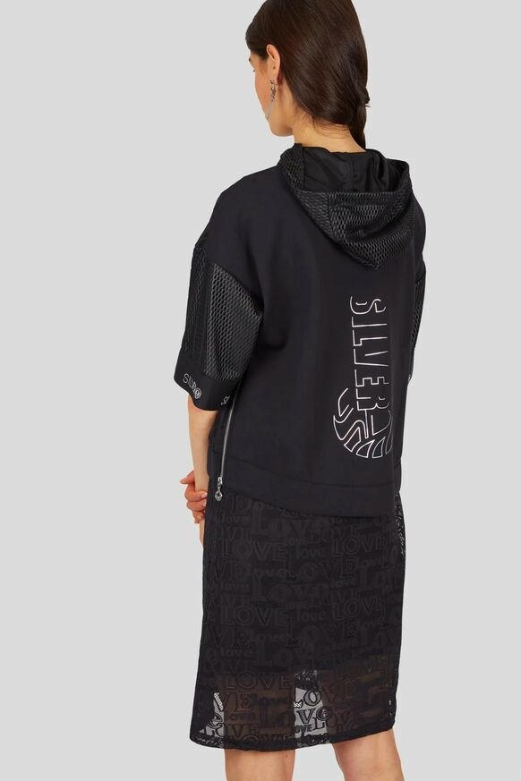 На сайте указаны Российские размеры. Жакет с короткими рукавами и капюшоном. Спереди имеются карманы. Молнии встроены в боковой шов, что позволяет варьировать ширину подола. Спину украшает благородный металлический переводной принт с логотипом Sportalm. Подол удлинен и слегка закруглен сзади.
