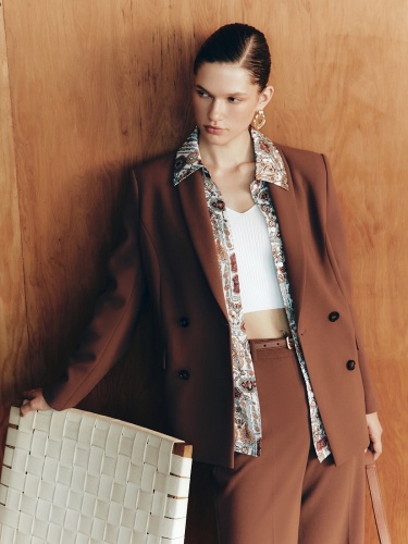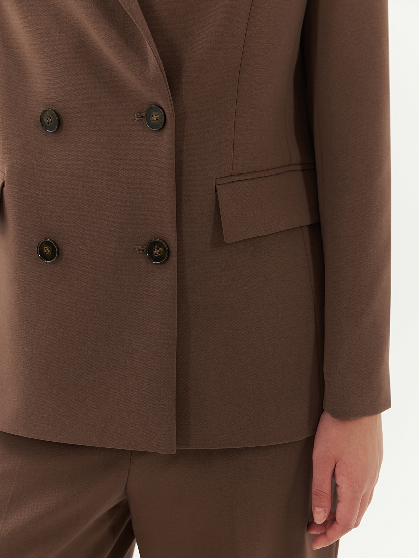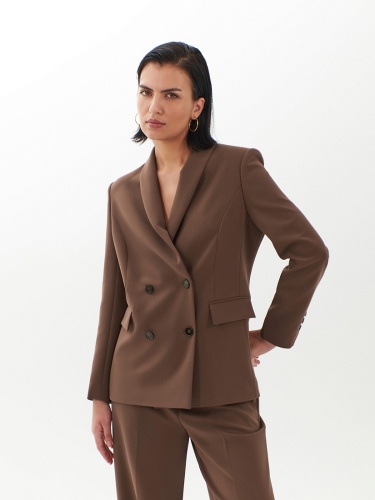 Классический двубортный полуприлегающий жакет с V-образным вырезом горловины, воротником-шаль. Выполнен из костюмной ткани в благородном цвете "каштан". На жакете прорезные карманы в рамку. Жакет на подкладке.